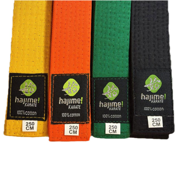 Karate solid color belt for grade or kyu exams of karate. 100 % Cotton. It weighs between 250 grams and 500 grams, depending on the size selected. They are made of quality cotton which gives them a perfect thickness for karate practice in the dojo.